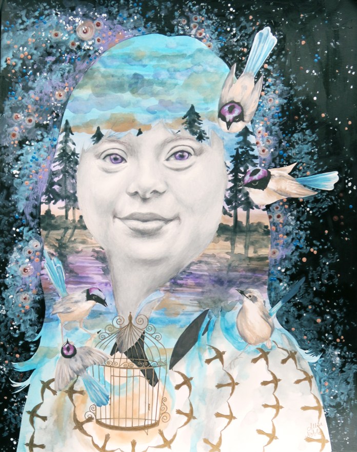 This is a hard question as I develop a connection to almost every piece of art I create like they are my children, no joke. That being said, at this point my favorite piece of art I created is “July: She Is Free”. This piece was from a 12 part series titled “Unlimited” that I showed at Founder’s Brewing Company for ArtPrize 2017. The series was comprised of 12 mixed media, surreal portraits in which the meaning was influenced by the use of pattern and color. The series depicted women of all ages, races, and time periods, each communicating a different story. The aim was for the pieces to speak to women’s collective experiences beyond their differences. We tend to think of time and events in terms of our own personal history or the history of the nation in which we currently reside. But of course, there are women everywhere living out their day to day lives all over the world, with hopes, dreams, fears, relationships… Our situations and struggles are very different, but were we in some alternate reality all given a chance to meet, I suspect we would find some surprising similarities, maybe more than we ever expected. We are all worthy of love, safety, respect, and dignity. I am particularly attached to July because it depicts someone with a visible disability, something that is almost never seen in portrait arts. I am a huge proponent of disability rights, empowerment, and visibility. This piece was shown and awarded at the Midland Artists Guild’s Annual Juried Exhibition of 2018, and I actually overheard an attendee afterwards whispering to a friend, “But why would you want to draw those kind of people?” This is why I do what I do. Visibility and education are vital, as prejudice is rooted in ignorance. I aim to continue to challenge what beauty is in art.